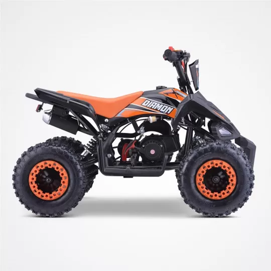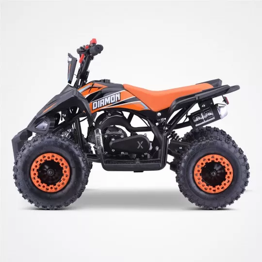 Ce quad pocket Diamon est propulsé par un moteur 2 temps de 49cm3 capable de développer une puissance maximale de 2,5 kW à 8000 tr/min. Cette motorisation parfaitement maîtrisée offre des sensations de conduite agréables pour les enfants. Vous pouvez ajuster la vitesse du quad pocket thermique en utilisant la vis de bridage des gaz, ce qui le rend adaptable au niveau de votre enfant.