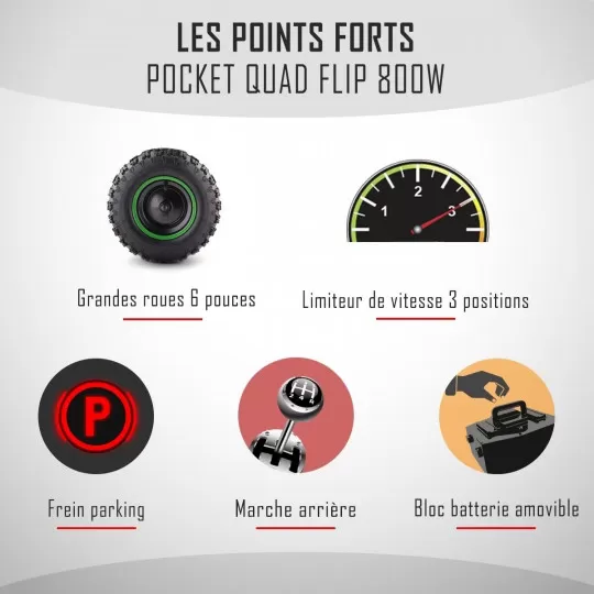 Le quad pocket Flip Diamon pour enfant est équipé d’un moteur électrique de 800w alimenté par trois batteries de 12V / 12 Ah. Cette configuration offre une vitesse contrôlée, parfaitement adaptée pour le plaisir des enfants. Cependant, ce pocket quad est également doté d’un limiteur de vitesse réglable situé à l’arrière du quad. Il peut être réglé en position lente, intermédiaire ou rapide, ce qui permet aux enfants de s’adapter progressivement à la vitesse.